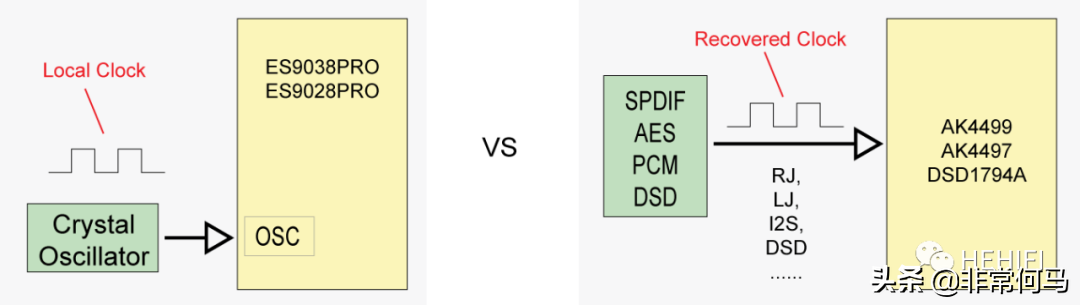 ESS公司的ES9038PRO作为目前为止行业内参数指标最高的芯片之一,片上集成了SPDIF接口,通过采用采样率的异步转换技术的Jitter消除电路,与前端传输Jitter去耦合,有很大的Jitter容忍度,HyperStream专利调制器能使Sigma-Delta调制器克服一些频域暂态的非常线性,外加其它的一些技术,如失真矫正、8通道可随意切换的差分DAC、专用的超低噪声线性电源(ES9311Q)等,作为性能最好的芯片,有许多的优势。
