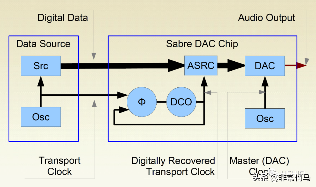 Sabre DAC的Jitter消除电路原理图,摘自《 About Jitter》AMM ESS, October 2011;