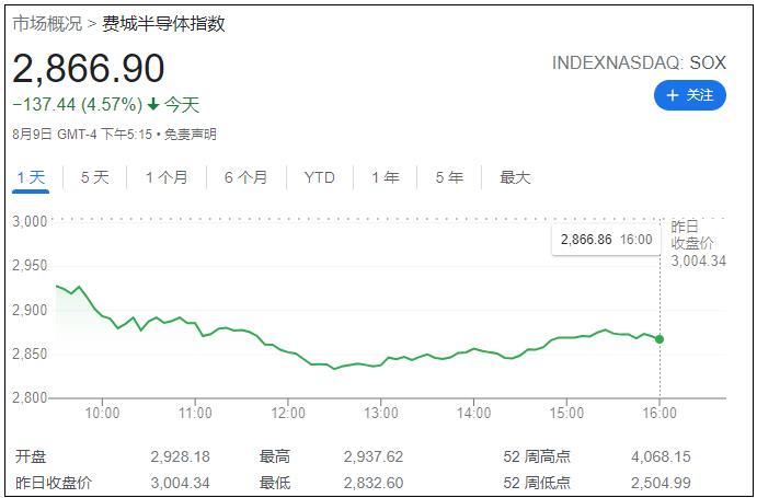 截至当地时间9日16时,费城半导体指数跌4.57%