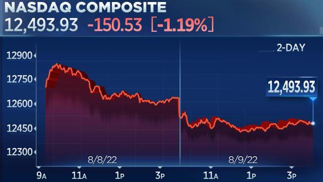 周二,纳指跌150.53点,跌幅为1.19%。图自美国消费者新闻与消费频道(CNBC)
