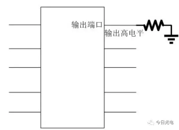 拉电流是电流从芯片内部往外"拉"出去的意思,所以电流方向是从内向外流的。拉电流也是针对输出端口而言的,当输出端口输出高电平时,芯片内部就有电流通过IO流出去给负载电路。如下图所示就是拉电流的示意图: