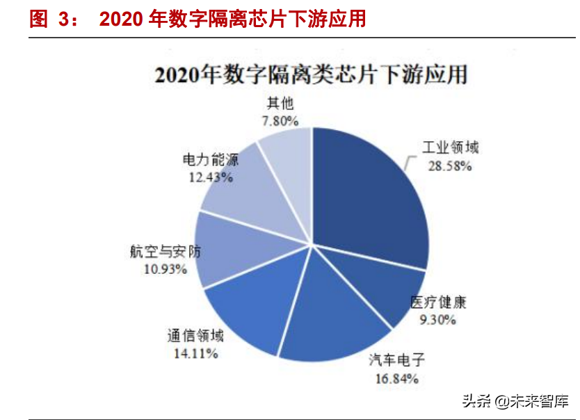 数字隔离芯片应用场景宽泛,新能源车、工控和光伏系统成为应用先驱。从下游需求来看,电动汽车、工控和光伏太阳能系统是率先采纳数字隔离器的应用先驱。因为这些系统对体积、转换效能、成本和高可靠度的要求愈来愈严苛,导致传统光电耦合器的性能逐渐不敷应用需求。此外,带隔离驱动的电机在工业领域使用增加、工业物联网对隔离接口的需求和汽车电气化对安规需求提升等因素,进一步促进了数字隔离类芯片市场的发展。根据 Markets and Markets 的数据,2020 年数字隔离类芯片在工业领域上使用最多,占比达 28.58%,其次是汽车电子行业,占比达16.84%,通信领域位居第三,占比达 14.11%。