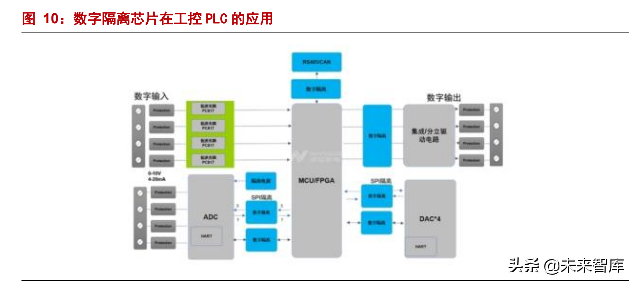 PLC:根据输入输出点位决定,每个点位需要一个数字隔离器,平均每个PLC输入输出点位约 30 个,即需要 30 个数字隔离器。此外还需要1 颗通讯用的隔离接口。
