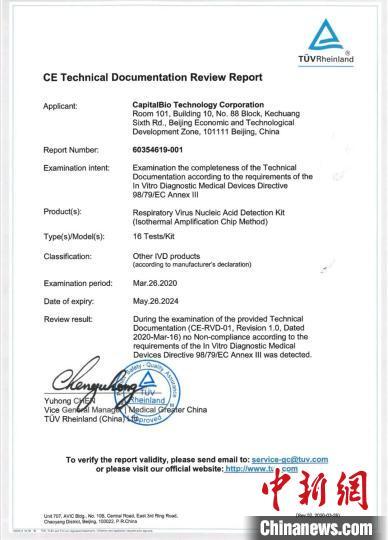 3月26日,博奥生物集团的六项呼吸道病毒核酸检测芯片试剂盒(恒温扩增芯片法)获CE-IVD认证(证书号:60354619-001)。 博奥生物集团供图