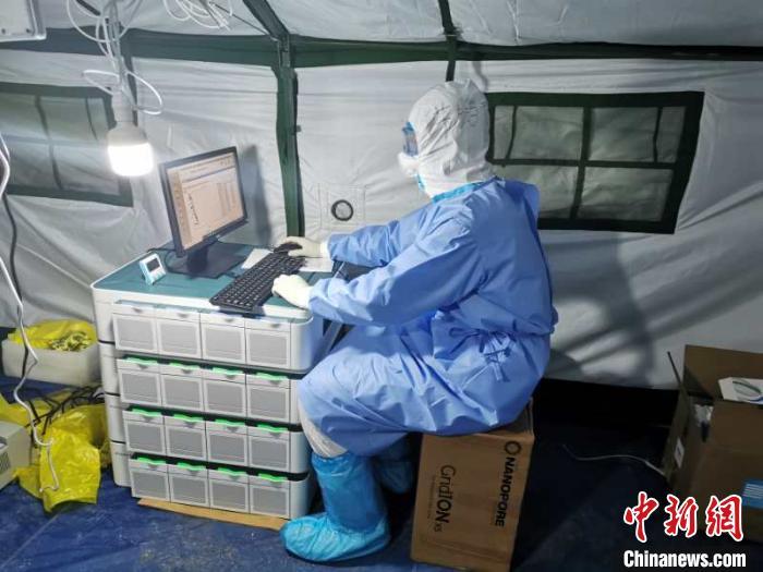 图为博奥生物集团旗下博奥晶典医学服务部牛鹏飞作为驰援武汉的技术检验团队成员之一,在火神山医院中工作。 博奥生物集团供图