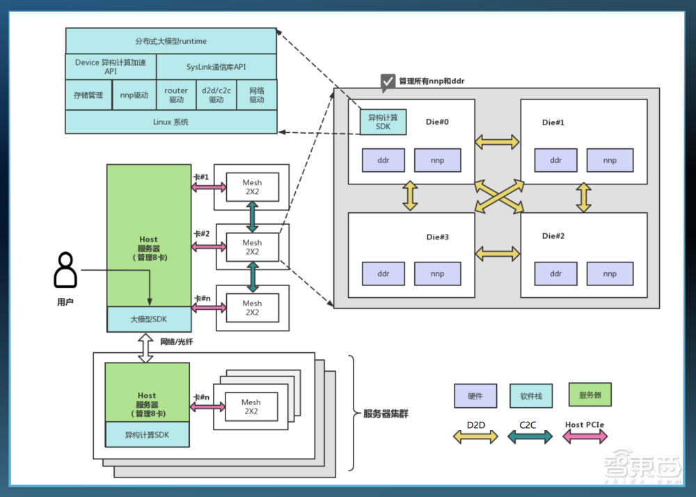 为了适应D2D/C2C架构,云天励飞构建了一套支持大模型部署的异构多核软件栈,包括设计了一套高效异构多核Syslink通信库,实现高效的D2D/C2C数据搬运管理、Mesh互联下的统一内存调度管理和模型分布式并行管理,因此能实现集群的大模型部署。