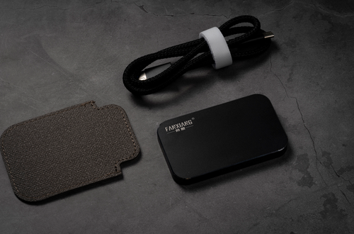 梵想移动固态硬盘P101外观精致,颜值高,机身采用高强度合金外壳,配上精美外围修饰,让你爱不释手,从此不同“梵想”。颜色分为两款,黑色和土豪金色,外配黑色保护套。正面板上印有FANXIANG(梵想)标识,背面印有容量信息和认证标识,看起来很简洁,外观精致,低调又不失时尚感。