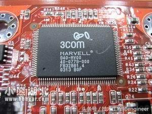 现在很多主板都集成了网卡。在主板上常见的整合网卡所选择的芯片主要有10/100M的RealTek公司的8100(8139C/8139D芯片)系列芯片以及威盛网卡芯片等。除此而外,一些中高端主板还另外板载有Intel、3COM、Alten和Broadcom的千兆网卡芯片等,如Intel的i82547EI、3COM 3C940等等。(见图18-3COM 3C940千兆网卡芯片)