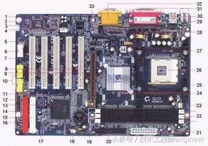 1是整合音效芯片,2是I/O控制芯片,3是光驱音源插座,4是外接音源辅助插座,5是SPDIF插座,6是USB插头,7是机箱被开启接头,8是PCI插槽,9是AGP4X插槽,10是机箱前端通用USB接口,11是BIOS,12是机箱面板接头,13是南桥芯片,14是IDE1插口,15是IDE2插口,16是电源指示灯接头,17是清除CMOS记忆跳线,18是风扇电源插座,19是电池,20是软驱插座,21是ATX电源插座,22是内存插槽,23是风扇电源插座,24是北桥芯片,25是CPU风扇支架,26是CPU插座,27是12VATX电源插座,28是第二组音源插座,29是PS/2键盘及鼠标插座,30是USB插座,31是并串口,32是游戏控制器及音源插座,33是SUP_CEN插座。
