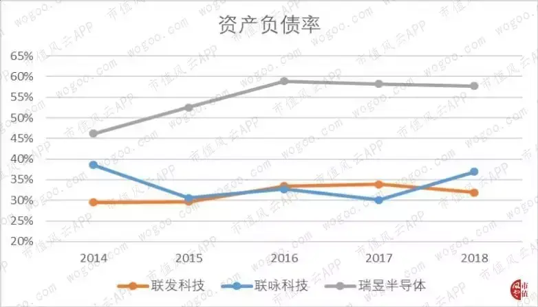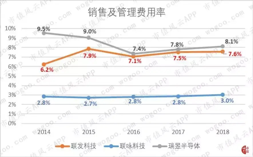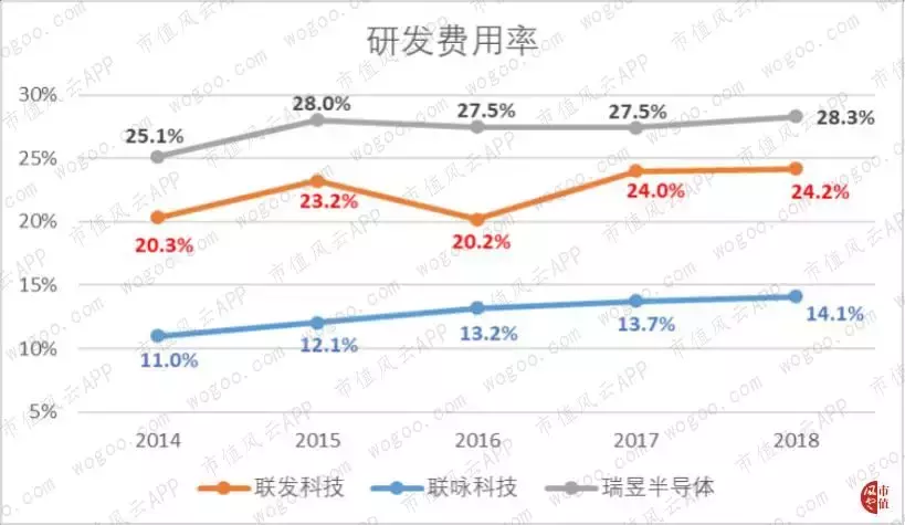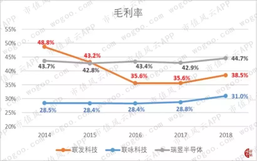 联咏和瑞昱的毛利率则均稳中有升,分别从2014年的28.5%和43.7%上升至2018年的31%和44.7%。