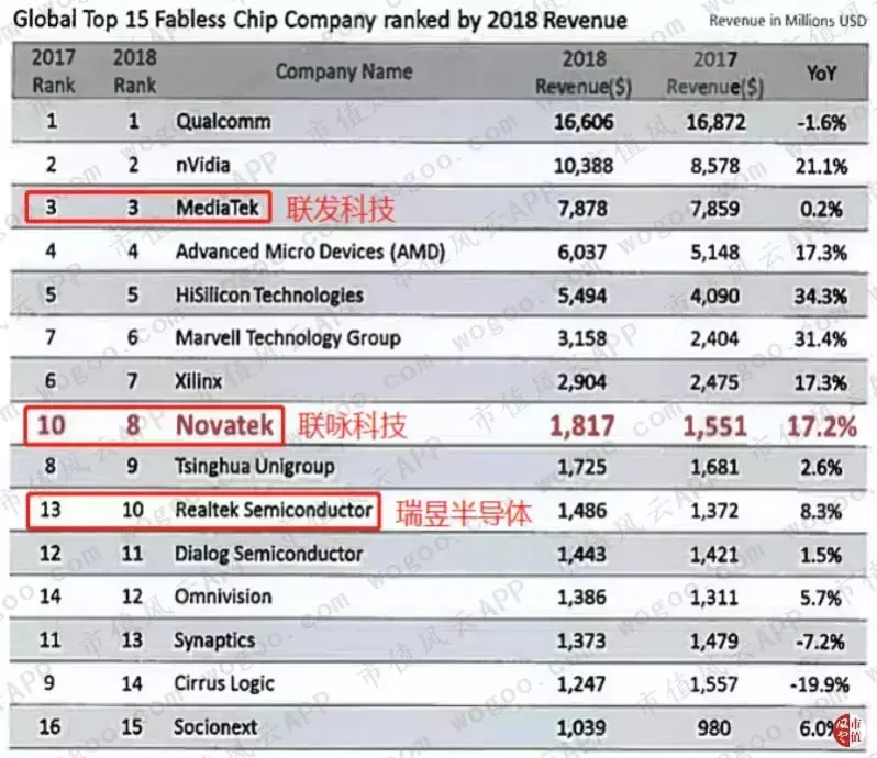 根据IHS的排名,2018年,在全球前15大无厂半导体公司中,台湾地区有三家上榜,分别为联发科技(MediaTek,联发科)、联咏科技(Novatek,联咏)和瑞昱半导体(Realtek Semiconductor,瑞昱)。