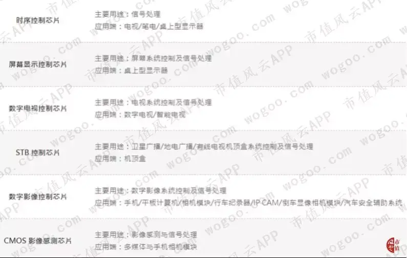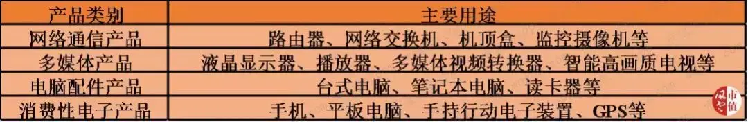 1、网络通信:例如用于路由器、网络交换器和机顶盒等。2、多媒体:例如用于液晶显示器、播放器、多媒体视频转换器和智能高画质电视等。3、电脑配件:例如用于台式电脑、笔记本电脑和电脑读卡器等。4、消费性电子产品:例如用于手机、平板电脑和GPS等。(数据来源:各公司年报,市值风云)