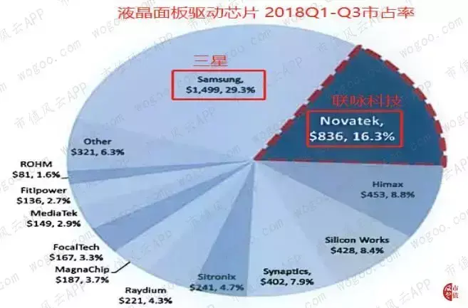 值得一提的是,长期以来,联咏是全球液晶面板驱动芯片的主要供应商之一。2018年前三季度,联咏的液晶面板驱动芯片的市占率为16.3%,仅次于三星(29.3%)。