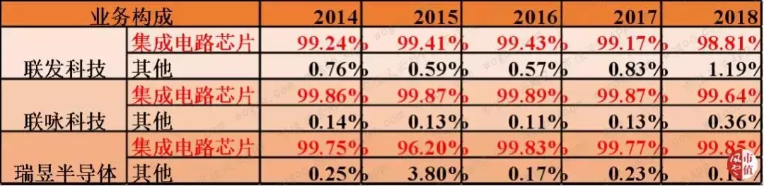 2018年,除了联发科外,联咏和瑞昱的其他业务占各自营收的比重均不到0.5%。