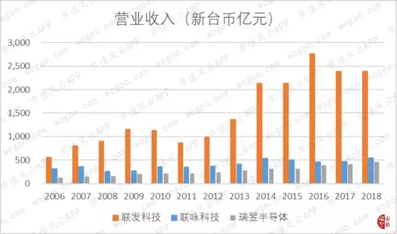 2006年,联发科、联咏和瑞昱的营收分别为564亿新台币、314亿新台币和126亿新台币,联发科的营收是联咏的1.8倍和瑞昱的4.5倍。