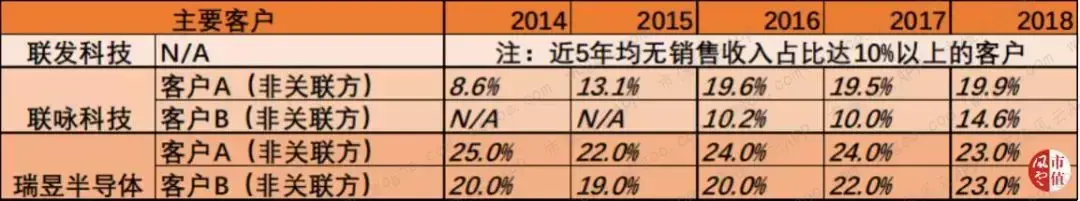 从主要客户上看,联发科近5年来均无销售收入占比达10%以上的客户。相比之下,2018年,联咏和瑞昱来自前两大客户的合计收入占比分别为35%和46%。