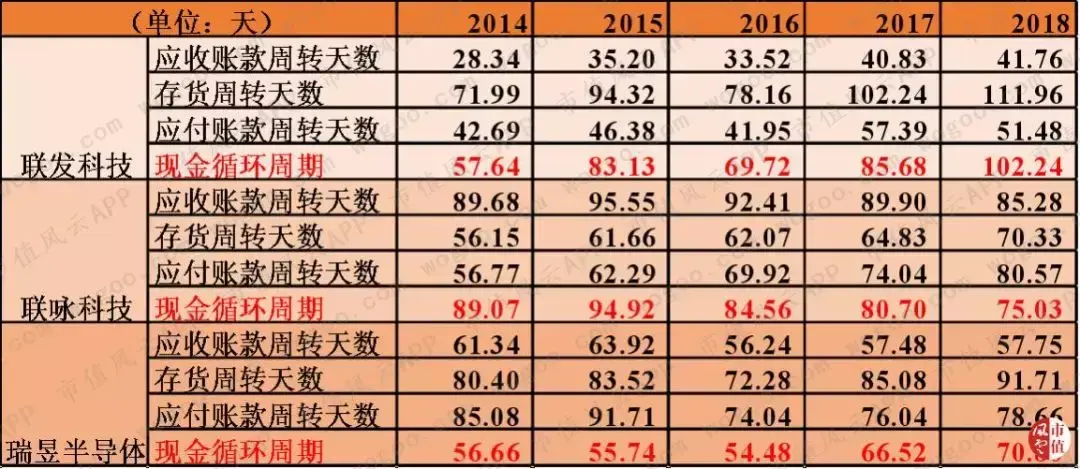 2018年,联发科、联咏和瑞昱的现金循环周期分别为102天、75天和71天,与2014相比,分别上升45天、下降14天和上升14天。