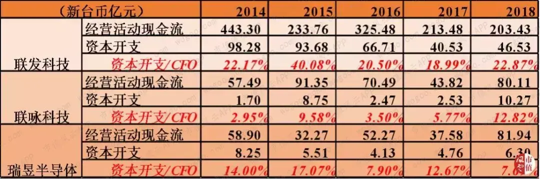 2018年,联发科、联咏和瑞昱的资本开支分别为46.5亿新台币、10.3亿新台币和6.3亿新台币,分别占当年经营活动现金流净额的22.9%、12.8%和7.7%。