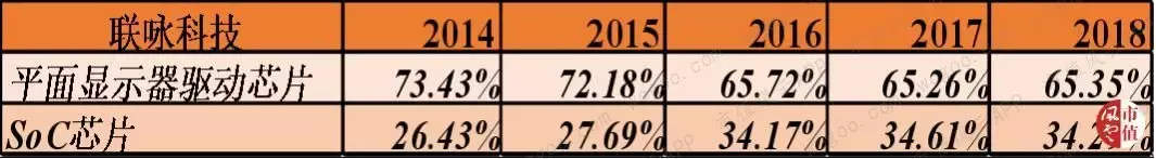造成这一变化的原因是近年来,联咏的另一个半导体产品——SoC芯片业务发展迅速,其营收占比从2014年的26.4%上升至2018年的34.3%。