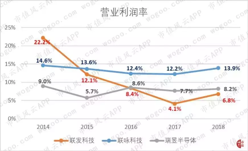 不过,三家公司的营业利润率在2018年较上一年略有回升,联发科、联咏和瑞昱当年的营业利润率分别为6.8%、13.9%和8.2%。