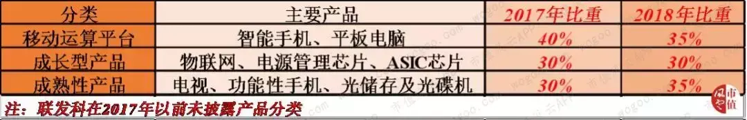 成熟型产品,是半导体技术在其中的运用已经较成熟的产品,比如用于电视、功能性手机、光储存及光碟机的集成电路芯片。成熟性产品的营收占比从2017年的30%上升至2018年的35%。
