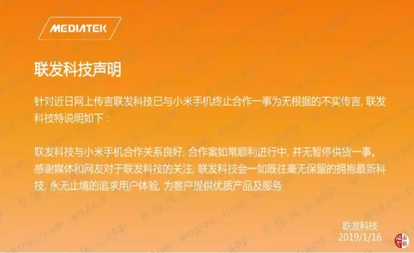 今年初,曾有传言称,联发科已与小米终止合作,不再为小米供应手机芯片。但联发科随即便发布澄清声明,称“联发科暂停对小米供货”完全是谣言。
