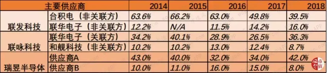 联咏和瑞昱从其主要供应商处的合计进货金额占比则较稳定,各自第一大和第二大供应商的占比均分别为40%和10%左右。其中,联咏的第一大供应商一直是其第一大股东联电,瑞昱则未披露主要供应商。