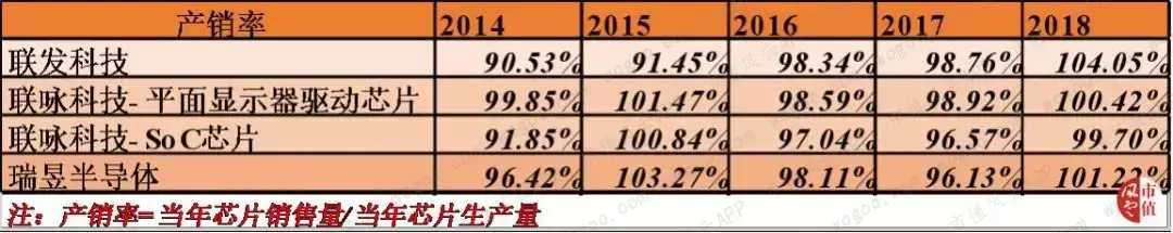 从产销率指标来看,无论是联发科、联咏还是瑞昱,其产销率近年来均有所提高,其中联发科的整体产销率从2014年的90.5%上升至2018年的104%。