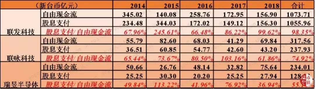 2018年,联发科、联咏和瑞昱支付的股息分别为156亿新台币、43亿新台币和28亿新台币,分别占各自当年自由现金流的99.6%、61.8%和36.9%。