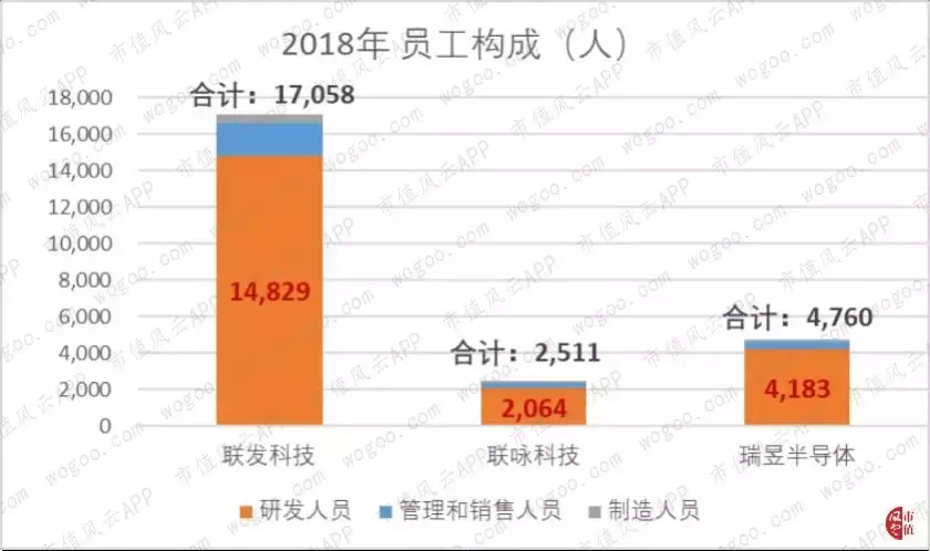以2018年为例,联发科、联咏和瑞昱的研发人员分别为14,829人、2,064人和4,183人,分别占其员工总人数的87%、82%、88%。