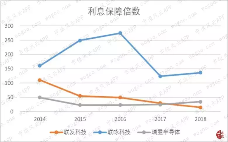 2018年,联发科、联咏和瑞昱的利息保障倍数分别为15倍、136倍和35倍。