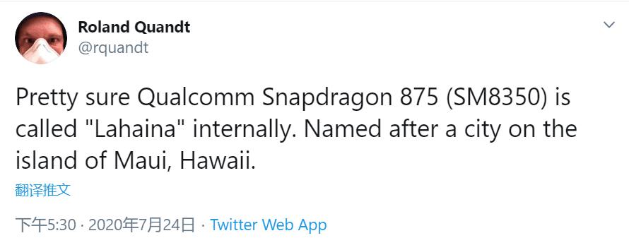 现在已经出现了有关高通下一代移动平台的详细信息,爆料者 Roland Quandt 透露,骁龙 875(SM8350)采用的内部代号为 Lahaina。Lahaina 位于美国夏威夷群岛茂宜岛最西端,夏威夷王国故都,它是七个夏威夷群岛之一。