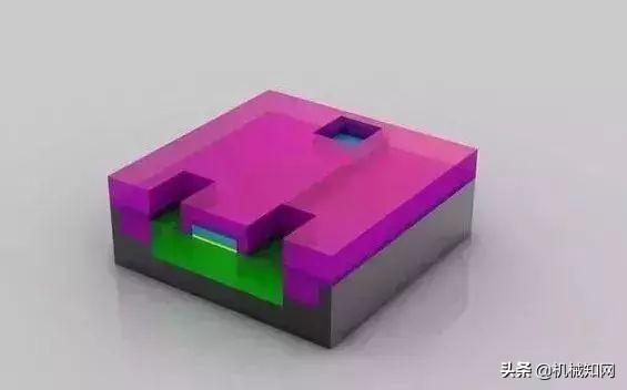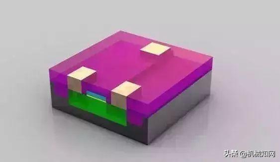 晶体管就绪: 至此,晶体管已经基本完成。在绝缘材(品红色)上蚀刻出三个孔洞,并填充铜,以便和其它晶体管互连。▼