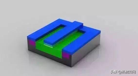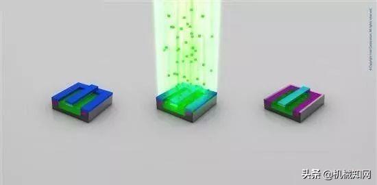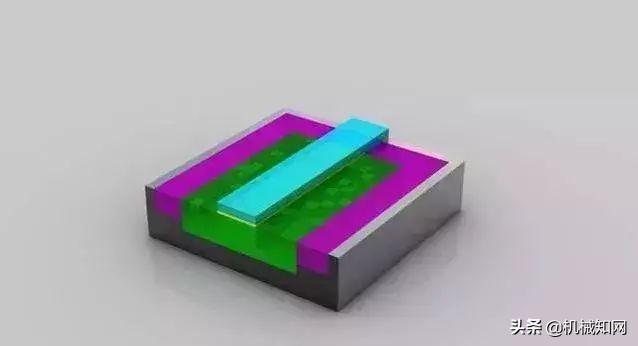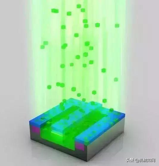 清除光刻胶: 离子注入完成后,光刻胶也被清除,而注入区域(绿色部分)也已掺杂,注入了不同的原子。注意这时候的绿色和之前已经有所不同。▼