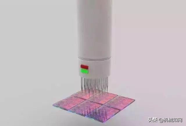 晶圆测试: 内核级别,大约10毫米/0.5英寸。图中是晶圆的局部,正在接受第一次功能性测试,使用参考电路图案和每一块芯片进行对比。▼