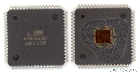 在晶片的的左下角,大家可以看到标识,(AT 355B6),还有企业品牌标识,出厂年份,所有的信息都是可以在这里看得到的。(有很多人说我不知道我芯片的型号是什么,最简单的就是开片看芯片的标识,当然,只有对芯片是非常熟悉的工程人员才能知道芯片的型号是什么,比如,你看到AT 355B6,你肯定是就不知道是哪一个型号,而我们就知道,是ATMEGA169P。当然,这只是最最最简单的,还有一些根本没有任何厂家信息的芯片!)