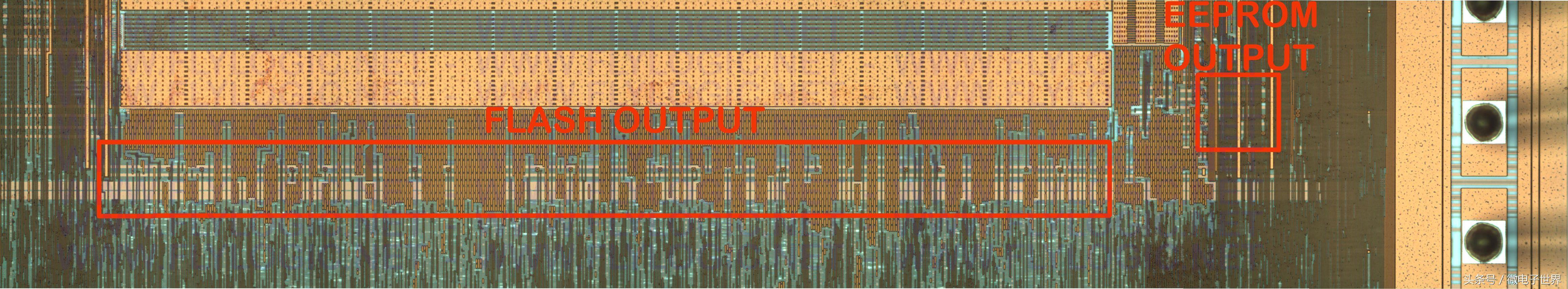 在此,大家可以看到,我已经把各个区给大家划分出来了,有FLASH数据存储区,数据总线区,RAM区,加密区等,一目了然。(大家可以看到,其实在高倍放大镜下面的晶片内部图是非常的整洁有序的,不得不配方芯片设计工程人员的细心程度啊!顿时我觉得网络上流传的服务器机房的布线师弱爆了!)