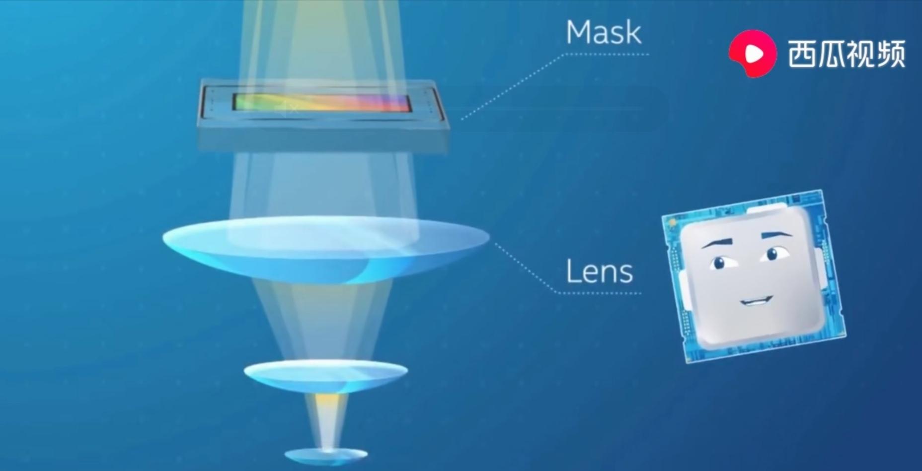 安装模板用光刻机将光照射到模板上,然后通过透镜缩小图像,最后在晶圆表面成像,技术人员会把电线连接上,所有不同的晶元使用不同的模板进行重复操作。