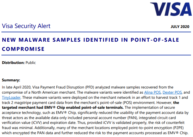 本月早些时候,全球最大的支付卡网络Visa发布了一份安全警报,内容涉及最近发生的一起商户泄密事件,已知的POS恶意软件系列显然被修改为针对EMV芯片的POS终端。