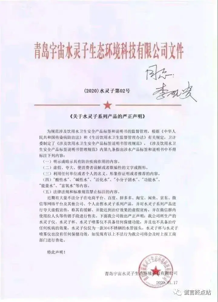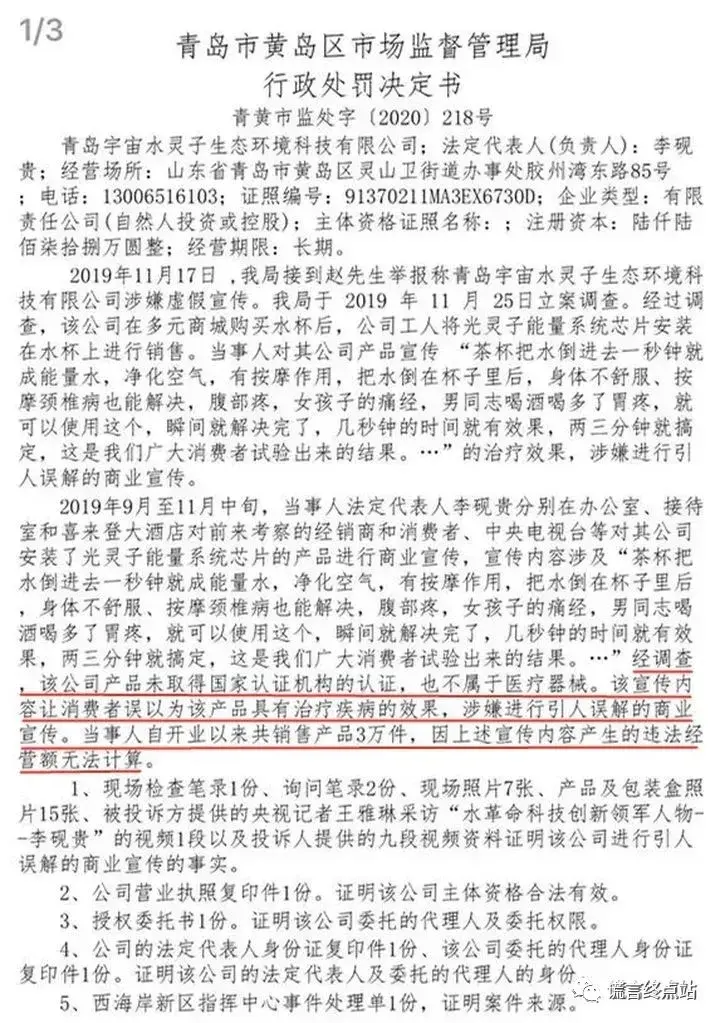 据悉,青岛西海岸新区市场监管局在今年一月份就对水灵子虚假宣传的案件进行了立案调查,现已调查终结,要求青岛宇宙水灵子生态环境科技有限公司停止违法行为,并将处以罚款。