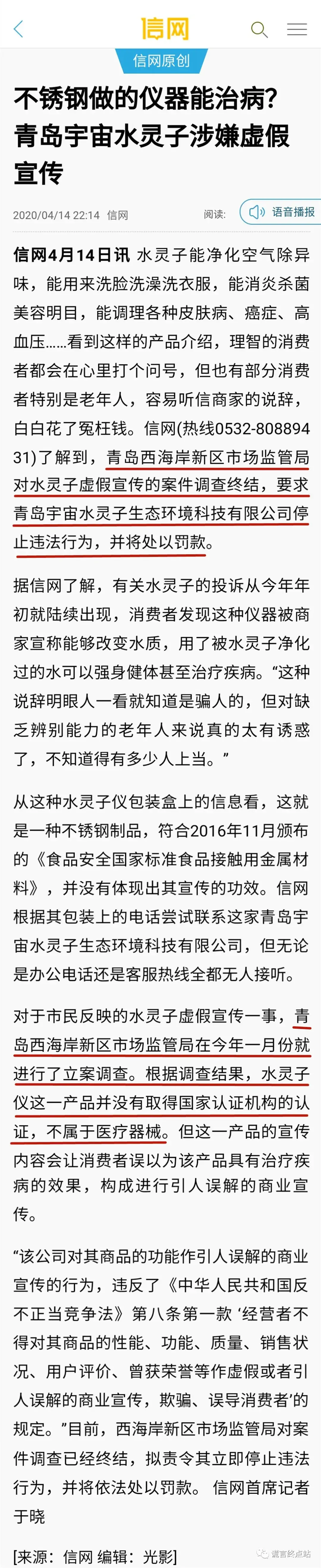 2020年4月14日,山东青岛当地知名媒体网站“信网”刊登报道,对“水灵子骗局”进行了曝光!