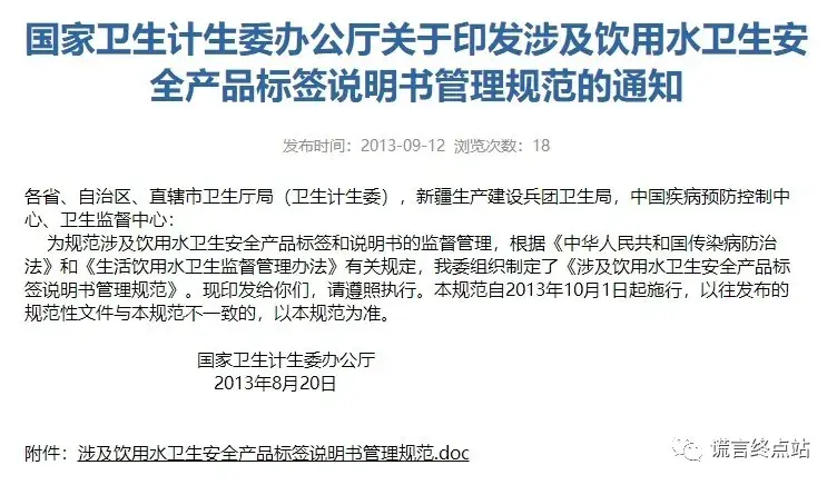 根据2013年颁布的《涉及饮用水卫生安全产品标签说明书管理规范》第六条规定:涉水产品标签和说明书中不得标注下列内容: