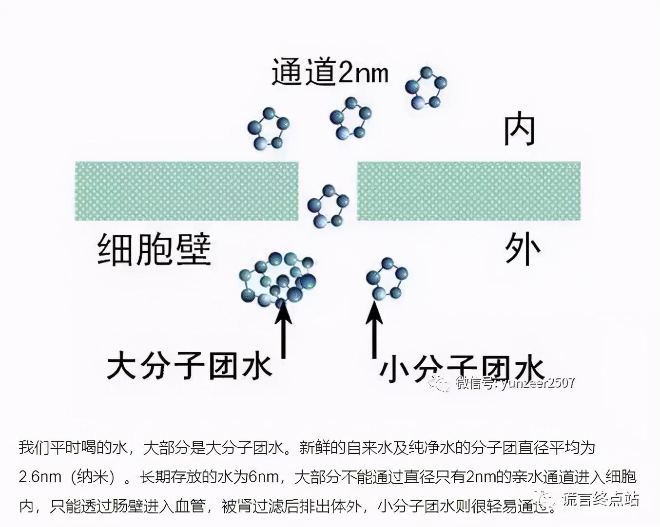 我们平时喝的水,大部分是大分子团水。新鲜的自来水及纯净水的分子团直径平均为2.6nm(纳米)。长期存放的水为6nm,大部分不能通过直径只有2nm的亲水通道进入细胞内,只能透过肠壁进入血管,被肾过滤后排出体外,小分子团水则很轻易通过。比如下面的宣传: