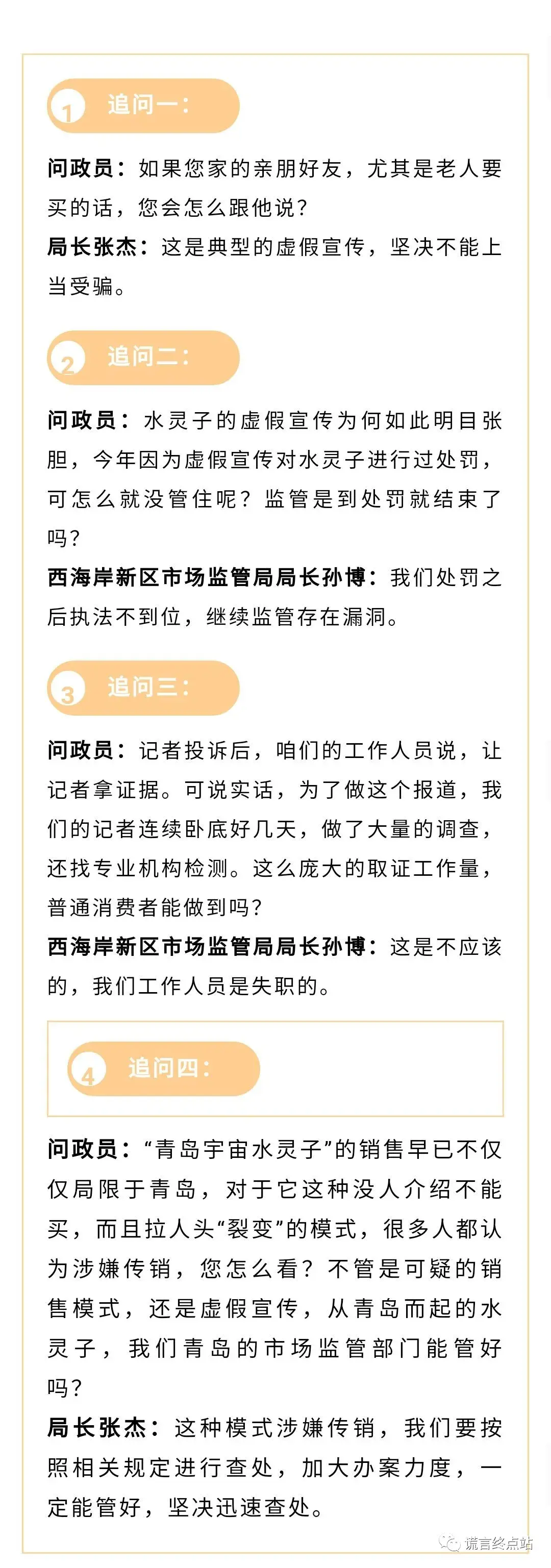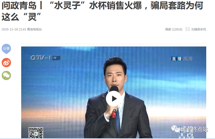 2020年11月18日,青岛电视台《问政青岛》栏目,专题曝光“水灵子骗局”,记者对此进行卧底调查,青岛市场监督管理局的主要领导作为嘉宾,现场表态立即查处!