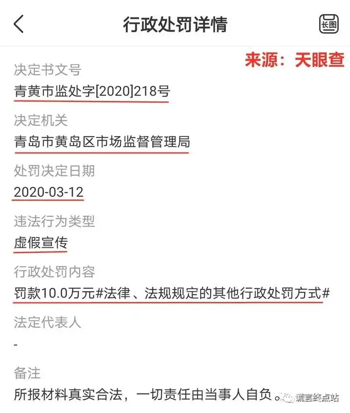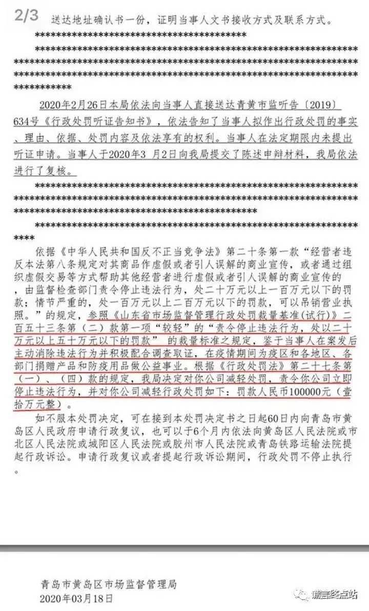 2020年3月12日,黄岛区市场监督局已对该公司进行了“行政处罚”(注:与上面报道中的西海岸新区市监局略有不同):