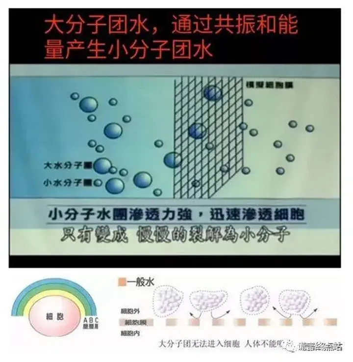 小分子团水能在人体细胞内外窜进窜出,渗透入人体细胞,把营养提供给细胞,并且把细胞里的细菌和毒素带出细胞外,从而达到抗衰老、除便秘、治疗慢性病、增强新陈代谢等排毒功效。这是国内外的各种“忽悠水”的所谓“科学原理”!