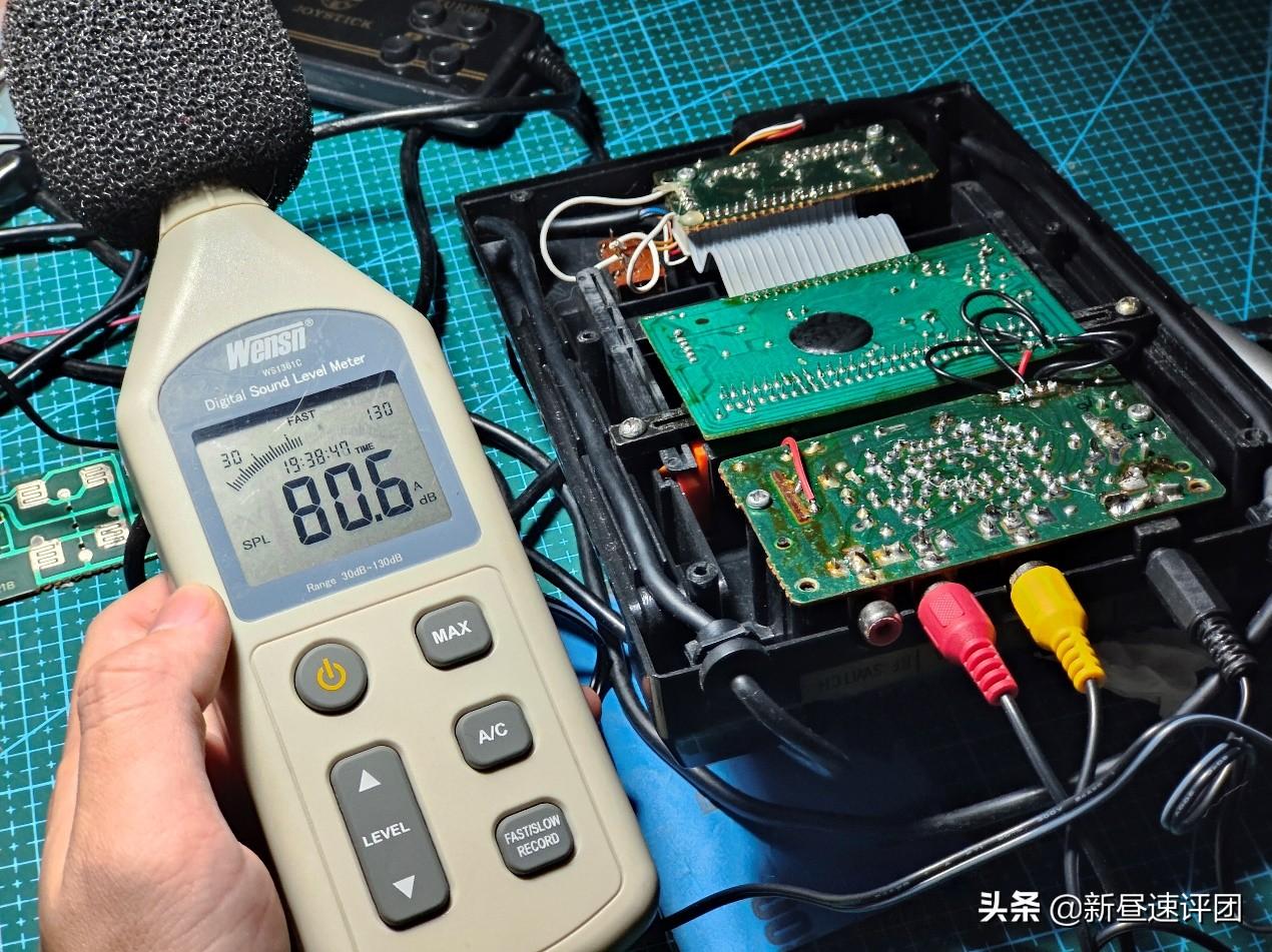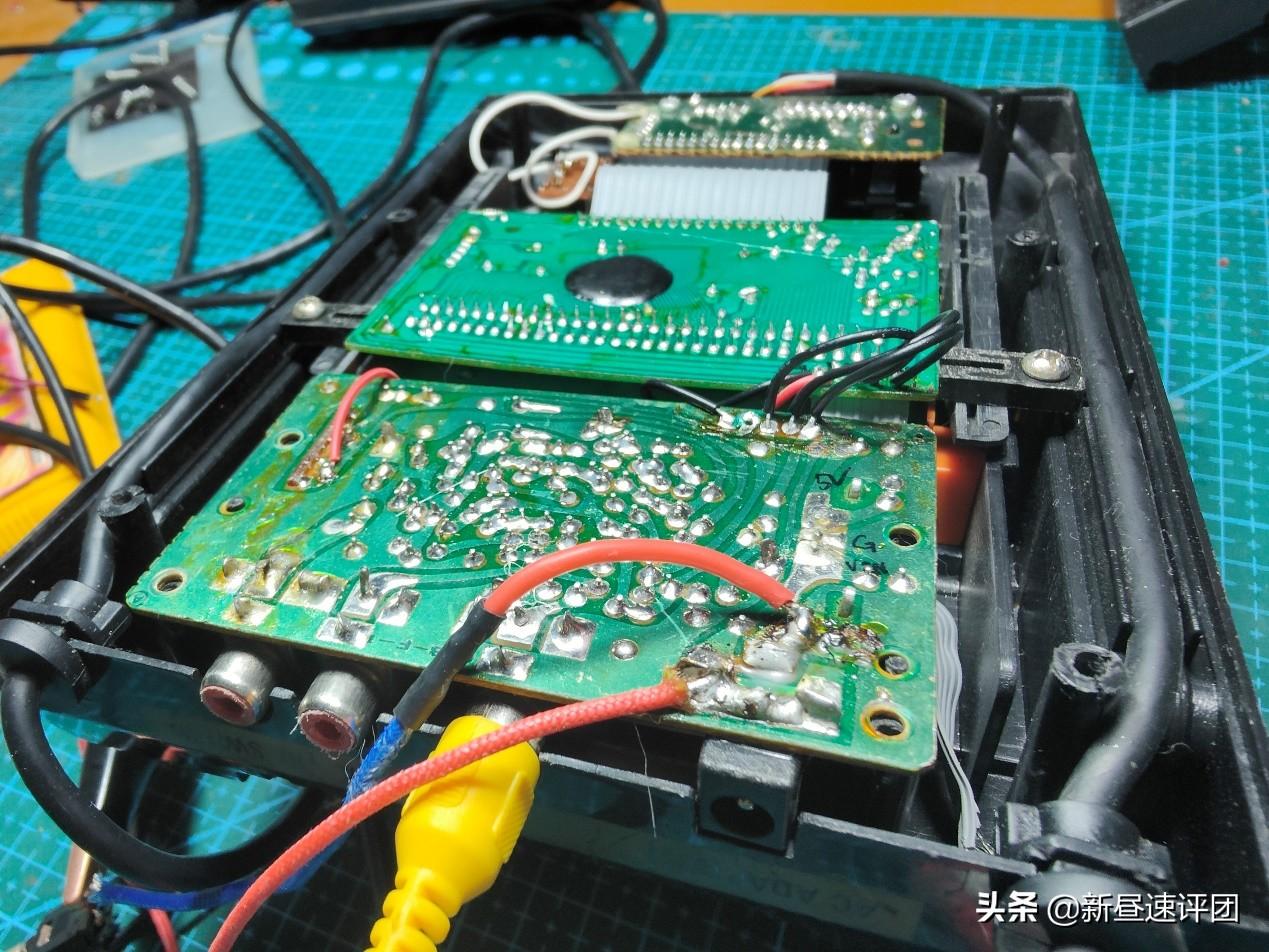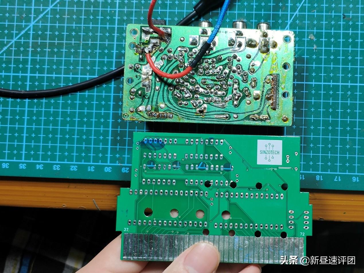 略为简陋的输出板,不管这已经算是比较豪华的了,后面更过分的都有。在靠近下方的位置有一个竖起来的PCB,这个上面有个音频芯片,功能是开机会响起“啊哈,小霸王其乐无穷啊”。