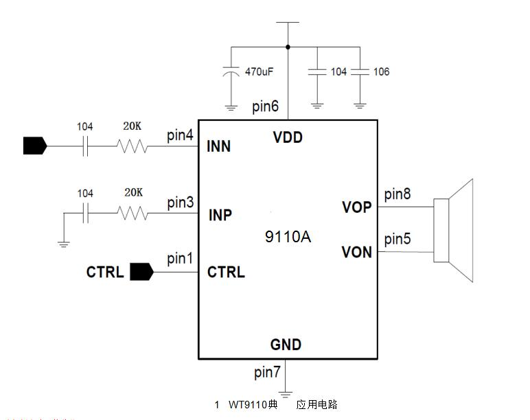 WT9110的应用电路简单,只需极少数外围电器件;输出不需要外接耦合电容或上举电容和缓冲网络;WT9110采用ESOP8封装,特别适合用于小音量、小体重的便携系统中;