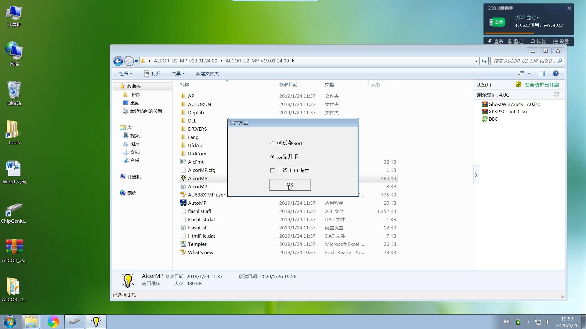 我们下载好安国的量产程序之后,解压缩进入文件夹找到AlcorMP这个程序,双击打开,打开后有一个提示直接点击确定。