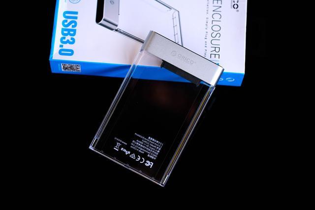 先来了解一下ORICO新推出的2.5英寸移动硬盘盒,它的尺寸为124.5 x 79 x 13mm,外壳材质为高硬度PC和铝合金,其中PC塑料为透明设计,可以直接看见盒内的固态硬盘。